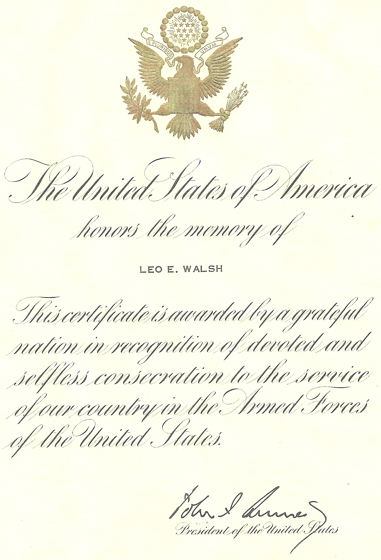 Letter from John F. Kennedy honoring Leo Walsh’s service and sacrifice to his country.